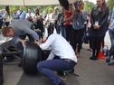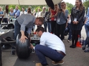 Bitte achten Sie bei der Platzierung darauf, daß sich links vom Vorderrad, an dem die Aktion durchgeführt wird, kein Glas (z.B. Schaufensterscheibe) in direkter Nähe befindet. Es kann vorkommen, daß ungeübten Teilnehmern eine Mutter oder ein Rad in der Hektik beim Aufschrauben wegspringt.
