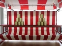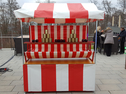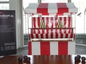 Glücksrad im Marktstand / Spielstand. Spielscheibengestaltung: Roulette-Motiv und 37 Feldern. Farbgebung: rot, schwarz, silbergrau. Scheibendurchmesser: 90cm.