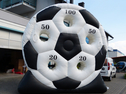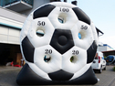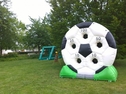 Die etwas andere Torwand. Hier sind echte Könner gefragt. Wer trifft mit einem Fußball eines der 5 Löcher des Fußballrades?