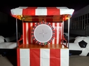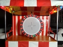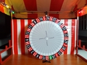 Glücksrad im Marktstand / Spielstand. Spielscheibengestaltung: Roulette-Motiv und 37 Feldern. Farbgebung: rot, schwarz, silbergrau. Scheibendurchmesser: 90cm. Standbeleuchtung optional.