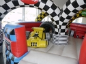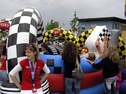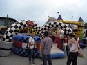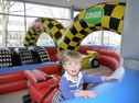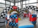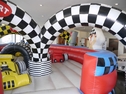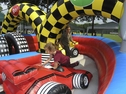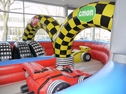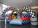 Riesenhüpfburg und Motorsport-Abenteuerland im Grand Prix Design. Die Welt des populären Motorsports - jetzt zum sicheren Erleben für Ihre kleinen Gäste! Spiel- und Abenteuerparcour mit Elementnachbildungen aus den Profirennserien, mit aufblasbaren Formulafahrzeugen, Reifenkriechtunnel, Boxenflagge, Start/Ziel. Der Aufbau und Betrieb ist nur auf ebenerdigen Flächen möglich (es dürfen keine Teer-Dehnungsfugen auf der stellfläche z.B. Parkplatz vorhanden sein). Der Untergrund muß trocken, sauber, wettersicher und tragfähig sein.