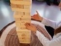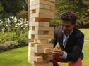 Riesenjenga mieten und bis zu 2,00m hoch bauen! RiesenJenga XXXL ist ein Stapelturmspiel und besteht aus 56 polierten Hartholzblöcken. Den Aufbau bildet zu Beginn des Spiels ein Turm mit 19 Schichten, bis zu 124cm Höhe. Dabei wird der Turm mit jeweils 3 Blöcken pro Schicht rechtwinklig zueinander aufgebaut. Der erste Spieler muss einen Block aus dem Turm entfernen und ihn wiederum rechtwinklig zu der darunterliegenden Schicht "on Top" auf die Spitze des Turmes legen. Ziel ist es, den Turm so hoch wie möglich zu bauen, ohne, dass er umfällt. Der Riesen Wackelturm JENGA XXXL kann bis zu 200cm hoch werden.