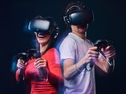 Bild: Young couple playing video games wearing virtual reality glasses with controllers. (Quelle: shutterstock.com/de/g/fxquadro)