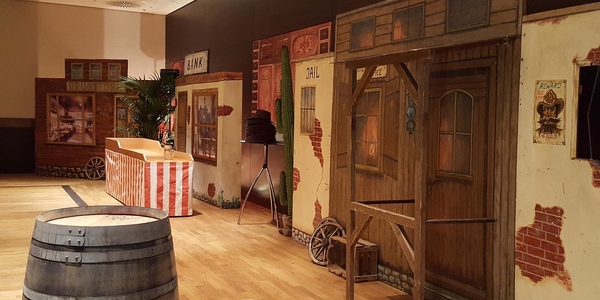 Wild West Kulissenwände mieten, Dekopaket mit 6 Wild West Kulissenwänden, auch einsetzbar für Film/TV, da sehr hochwertig, handbemalt. Erforderliche Stellflächen: indoor oder überdacht. Eigenschaften: Westernkulissen selbststehend, nach hinten abgestützt, mit Sandsäcken beschwert.
