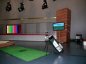Video-Golfsimulation mit Sensorabschlagmatte, Eventsimulatorensoftware, Golf-Drivingrangeprogramm, Hochleistungsrechner und hochwertigem Schlägerset.